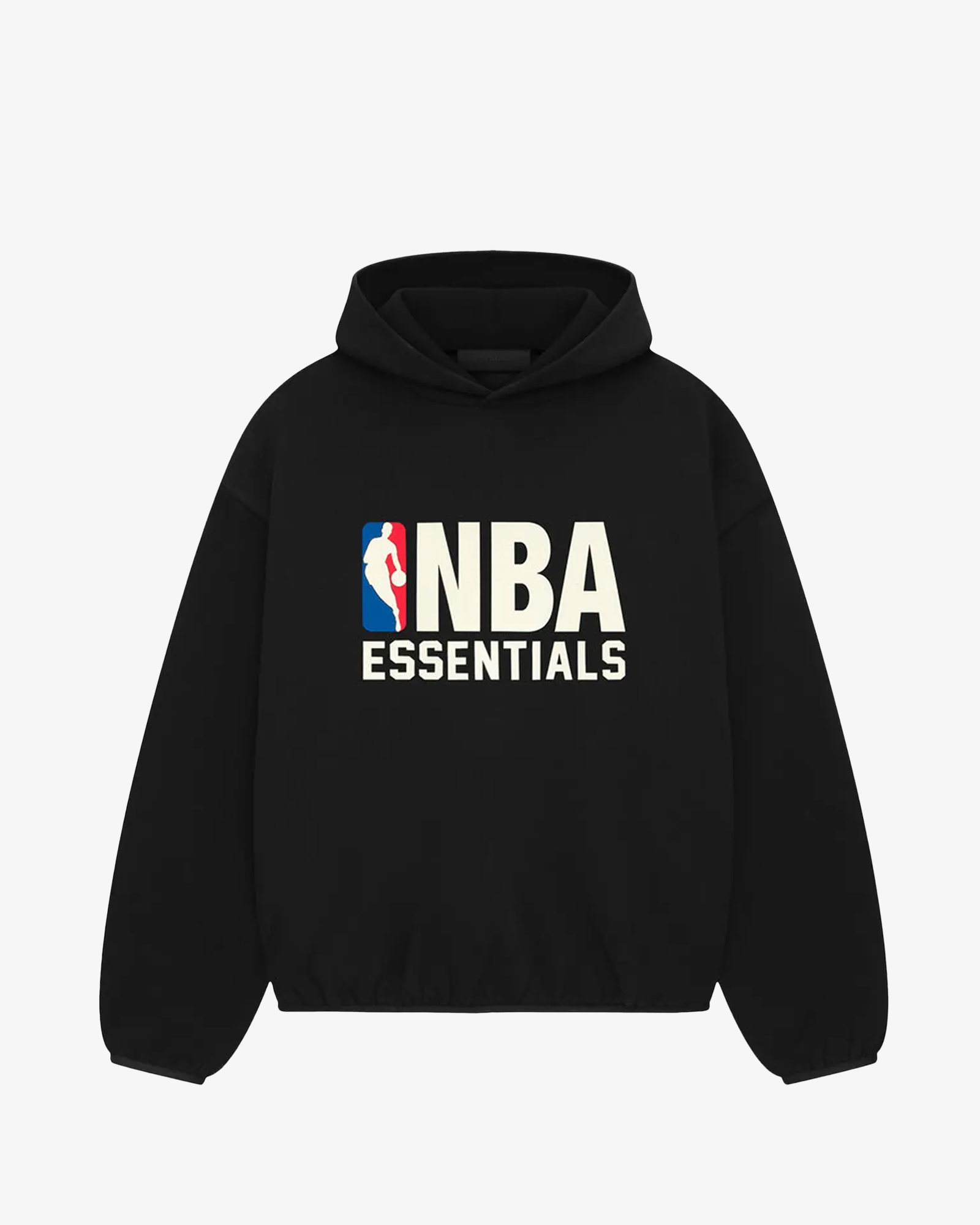 The Fear of God Essentials Black hoodie features an oversized fit, a rubber brand label at the upper back, and a Fear of God Essentials 3D logo graphic at the left chest and back.