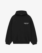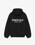 The Fear of God Essentials Black hoodie features an oversized fit, a rubber brand label at the upper back, and a Fear of God Essentials 3D logo graphic at the left chest and back.