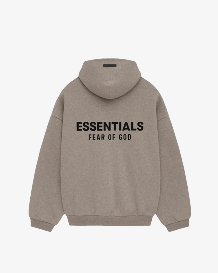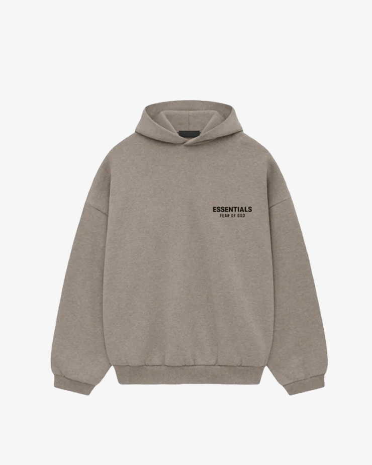The Fear of God Essentials Heather Grey hoodie features an oversized fit, a rubber brand label at the upper back, and a Fear of God Essentials 3D logo graphic at the left chest and back.