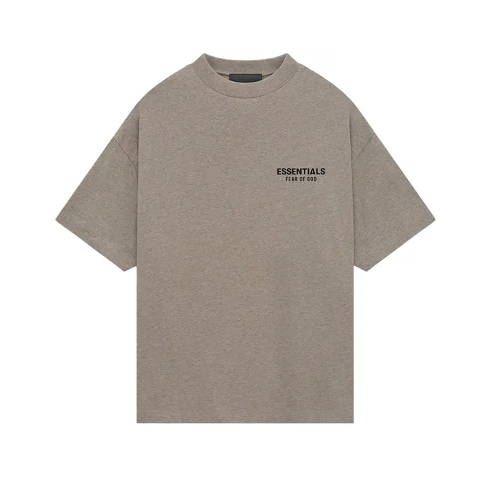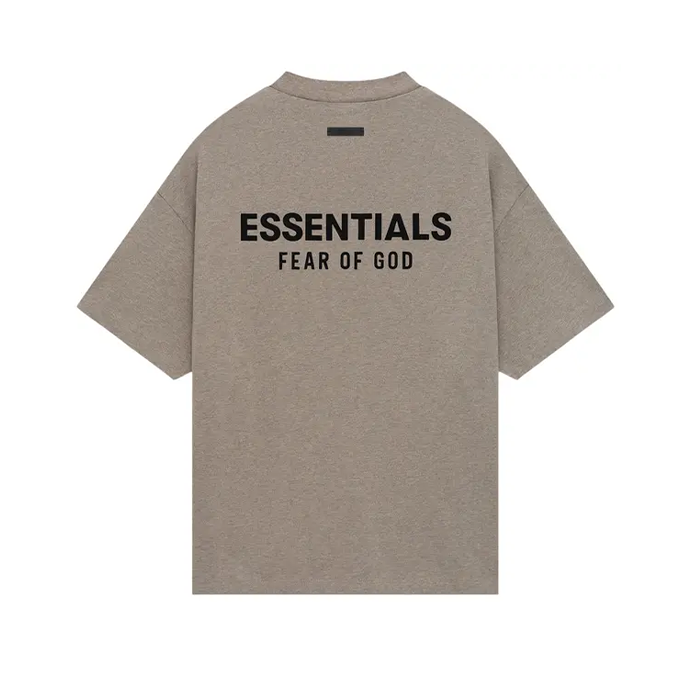 The Fear of God Essentials Heather Grey Crew Neck T-Shirt features an oversized fit, short sleeves with dropped shoulders, a classic crew neck, a rubber brand label at the upper back, and a Fear of God Essentials soft-touch logo graphic at the left chest and back.