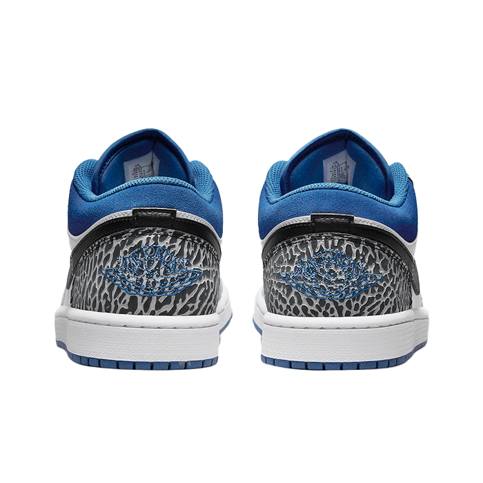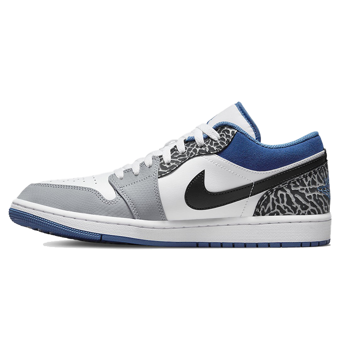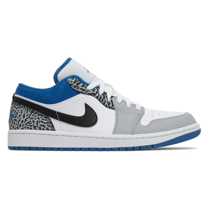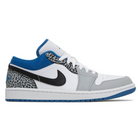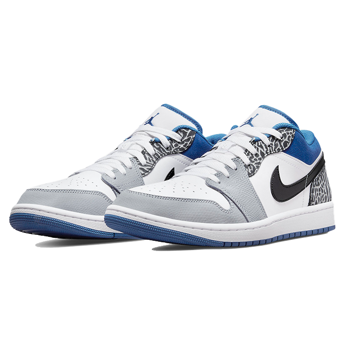 The Nike Air Jordan 1 Low 'True Blue Retro' is a stylish and unique sneaker that is sure to turn heads. The shoe's grey leather around the toe area is complemented by white accents and a black swoosh, creating a clean and classic look. The heel is covered in a bold leopard print that adds a touch of edginess to the design. Around the ankle area, a luxurious blue suede adds a pop of color and texture. The sole is also blue, completing the shoe's cohesive and eye-catching design. With its combination of classic and modern elements, the Nike Air Jordan 1 Low 'True Blue Retro' is the perfect addition to any sneakerhead's collection.