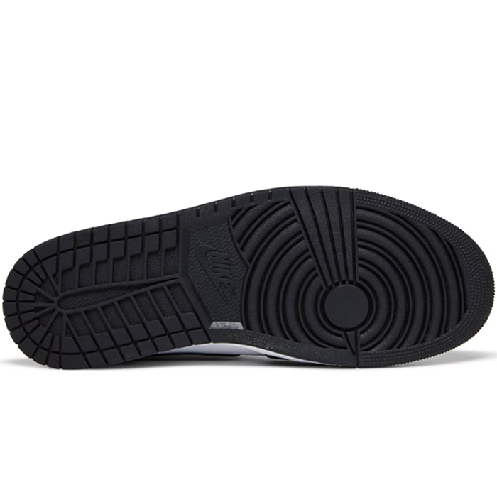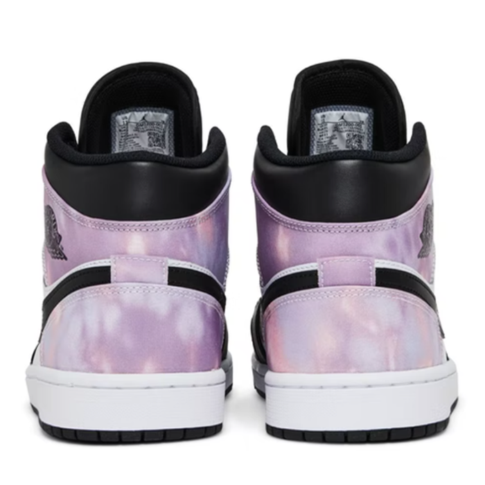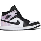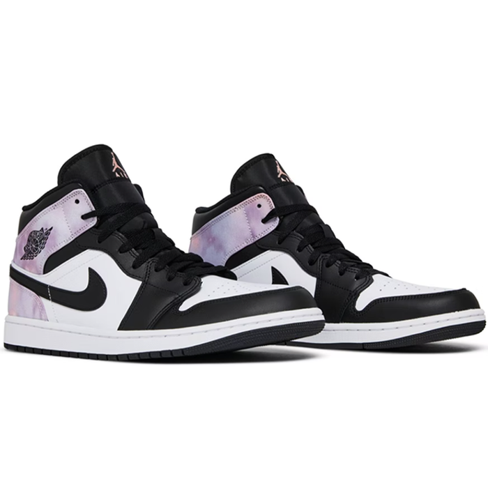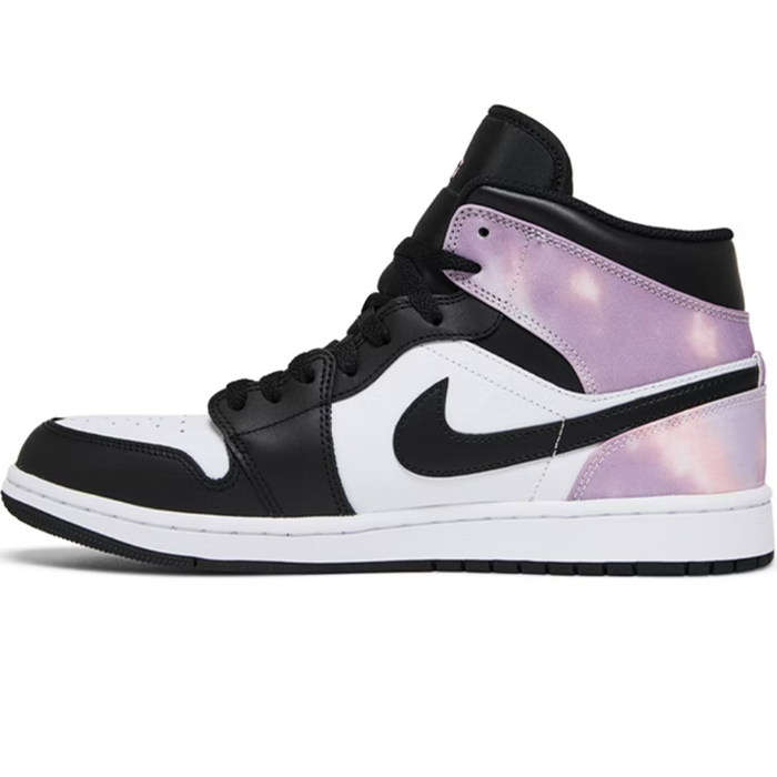 The Nike Air Jordan 1 Mid 'Zenmaster' shoe is a bold and stylish footwear option for those who want to make a statement with their footwear. The black leather around the front of the shoe is accentuated with white detailing, creating a striking contrast that draws the eye. The black swoosh and sole further enhance this effect, while the purple and pink tie-dye at the heel and ankle add a pop of color and a touch of playful personality to the overall design. With its combination of sleek design and eye-catching details, the Nike Air Jordan 1 Mid 'Zenmaster' shoe is a must-have for anyone who wants to elevate their footwear game.