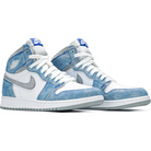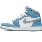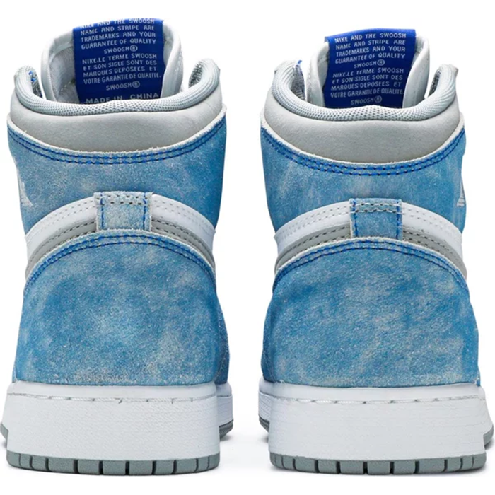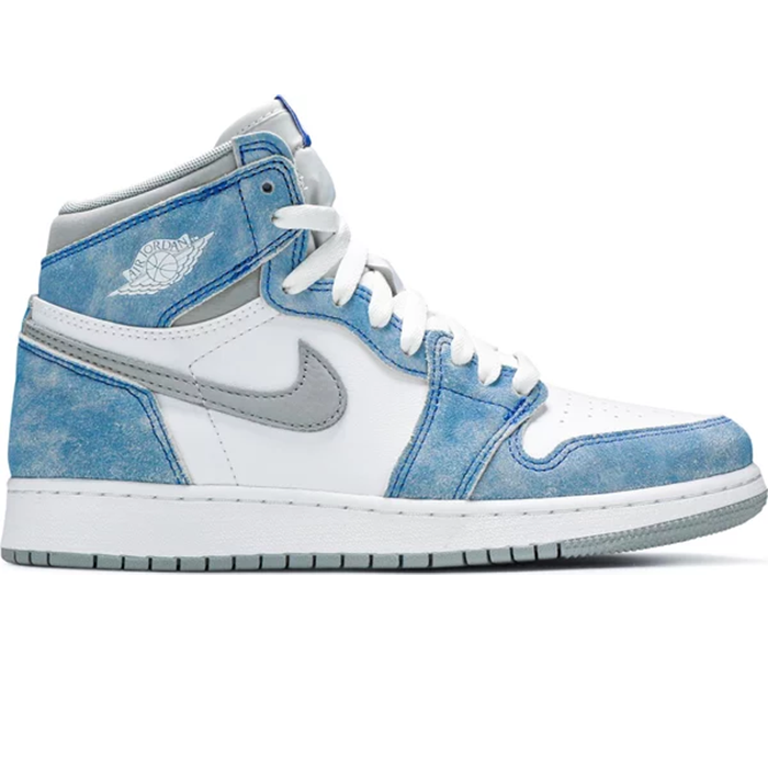 Made for big kids, the Air Jordan 1 Retro High OG GS ‘Hyper Royal’ showcases a distressed aesthetic, highlighted by pale blue suede overlays in a faded, uneven finish. The rest of the upper is constructed from white leather with signature Swoosh branding in light grey nubuck. Nike Air hits on the sockliner and woven tongue tag confer an OG touch. The high-top is mounted on a standard AJ1 cupsole, complete with encapsulated Air sole cushioning.