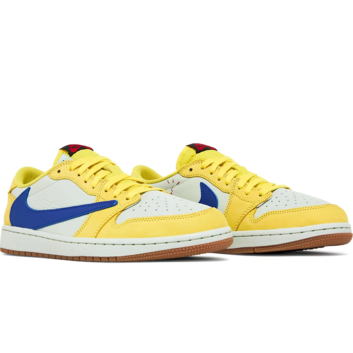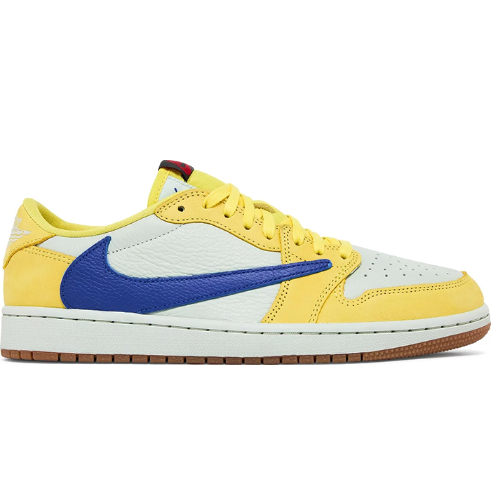 The Travis Scott x Women's Air Jordan 1 Retro Low OG SP 'Canary', also known as 'Elkins' after Travis Scott's High School, showcases the Houston rapper's signature reverse Swoosh, in Racer Blue adorning the lateral side of the shoe. A white leather upper is contrasted with yellow overlays at the forefoot and heel. A red and black Nike Air tag adorns the tongue, while mismatched Cactus Jack and Jordan Wings branding is embroidered in white on the heel tab of each shoe. The sneaker is underpinned by a traditional cupsole, highlighted by white textured sidewalls and a gum rubber outsole.