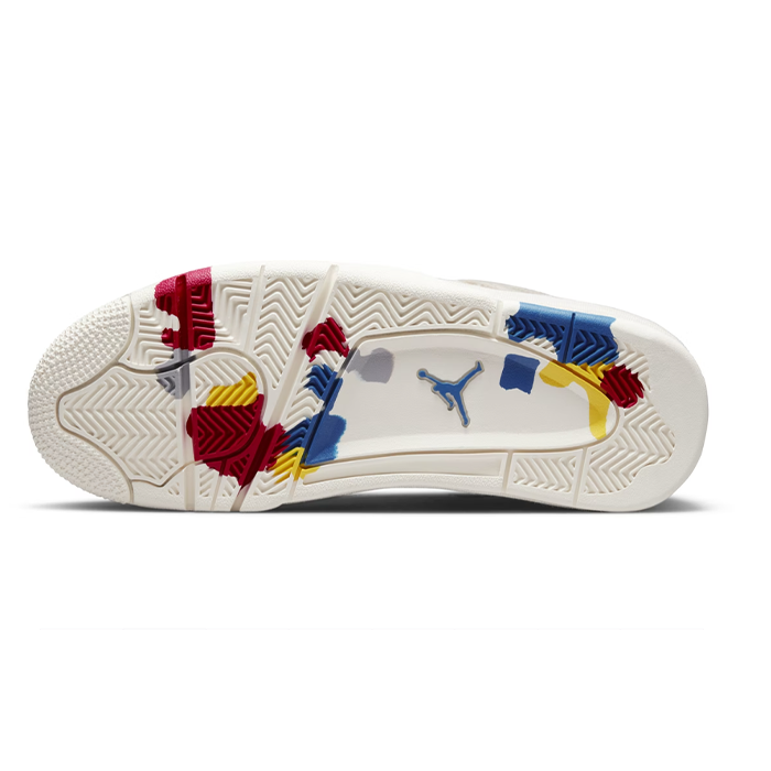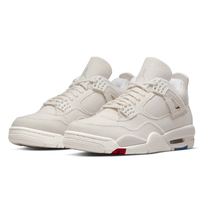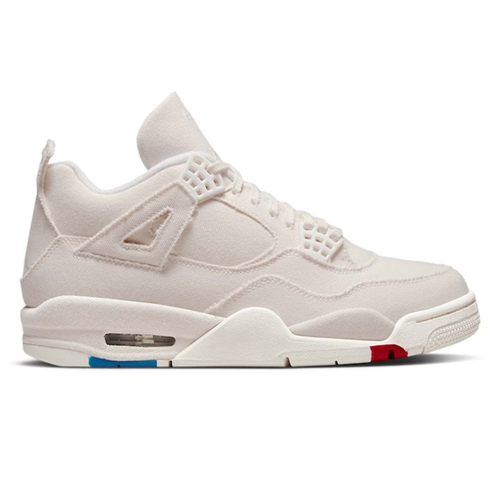 The Nike Air Jordan 4 Retro 'Blank Canvas' shoe is a stylish and versatile footwear option that is perfect for those who love classic and minimalist designs. The shoe features an off-white canvas material that provides a clean and sophisticated look. The unique touch of this shoe is the paint splattered on the sole in red and blue, which adds a pop of color to the overall design. The splatters can also be seen on the midsole, creating a cohesive and artistic look. With its iconic Jordan branding and comfortable fit, this shoe is a must-have for any sneakerhead looking for a stylish and trendy shoe to add to their collection.