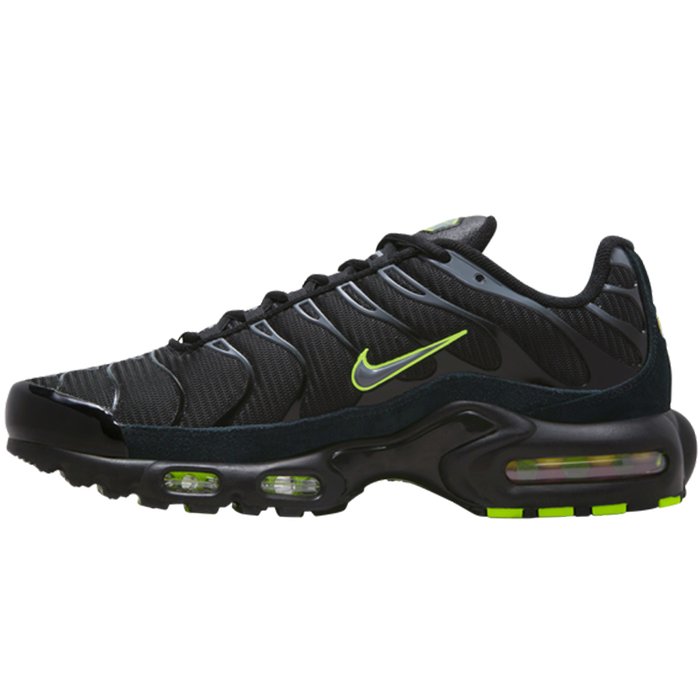 Introducing the Nike Air Max Plus TN 'Black Volt.' Stylish and high-performance, these sneakers feature a black upper with volt green/yellow accents. With premium materials, comfortable fit, and Air Max cushioning, they deliver unrivaled style and comfort. Elevate your athletic game with the Nike Air Max Plus TN 'Black Volt.'