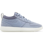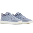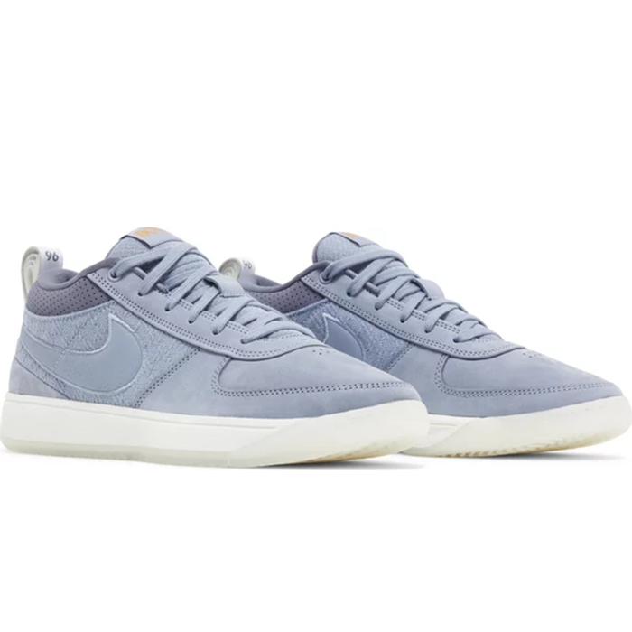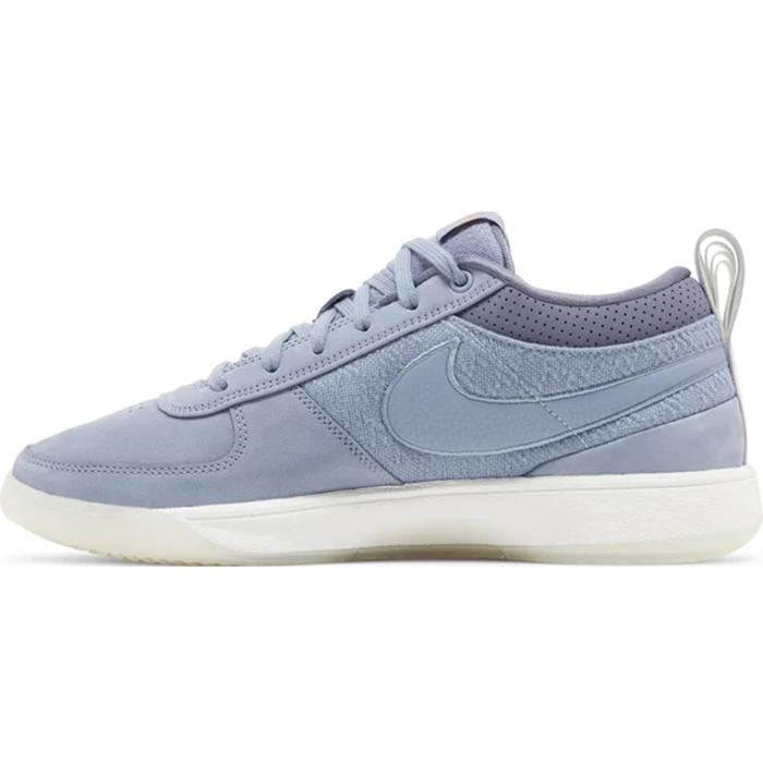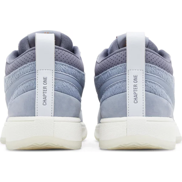 The Nike Book 1 'Mirage V2' presents a subtle Ashen Slate hue on the upper, featuring patterned textile side panels and nubuck construction along the forefoot. 'Book' is spelled out in orange lettering on the tongue tag, while 'Chapter One' is etched on the leather heel tab. The low-top rests on a lightweight Cushion midsole, fitted with a top-loaded Zoom Air unit in the heel and reinforced with a TPU sidewall for lateral support. Underfoot, a semi-translucent rubber outsole utilizes a herringbone tread for stop-and-go traction.