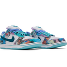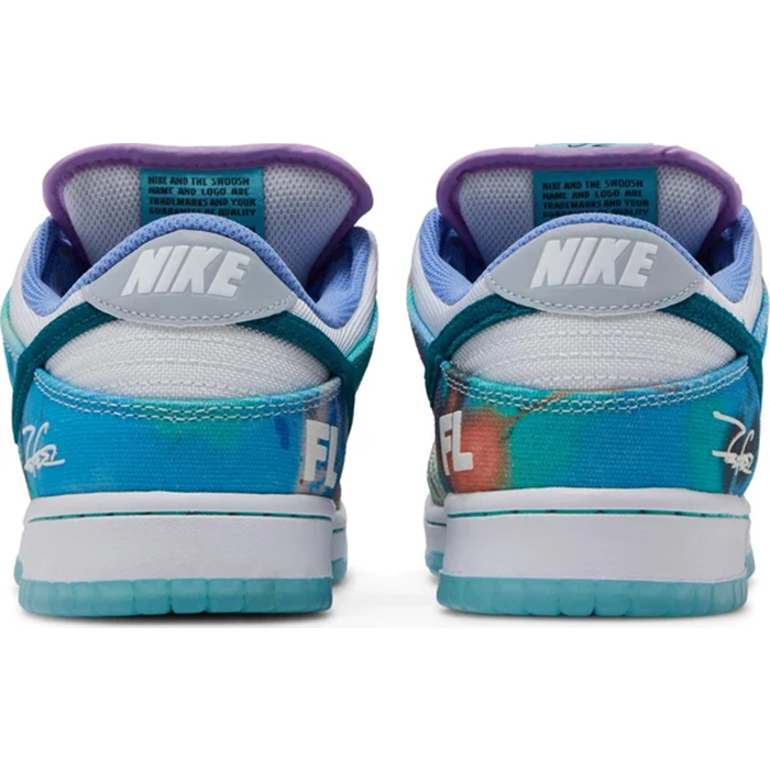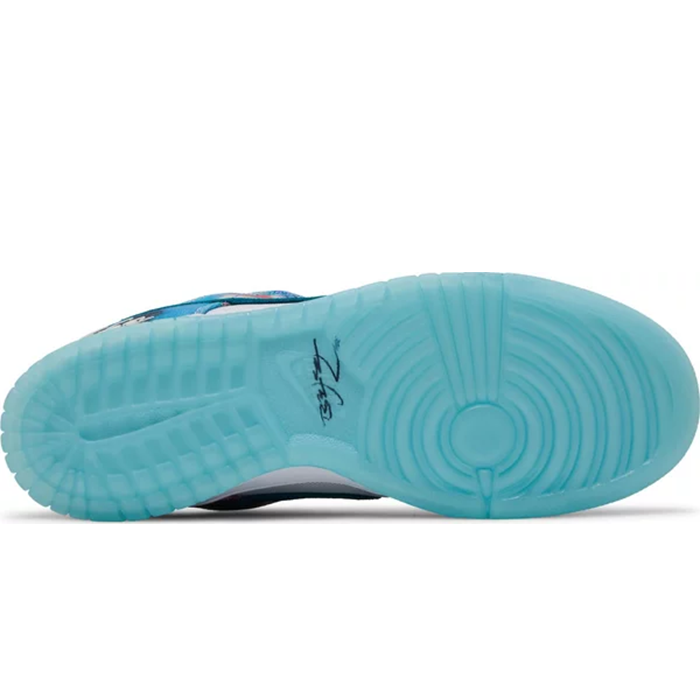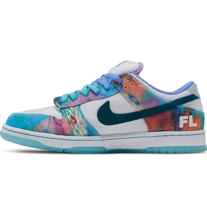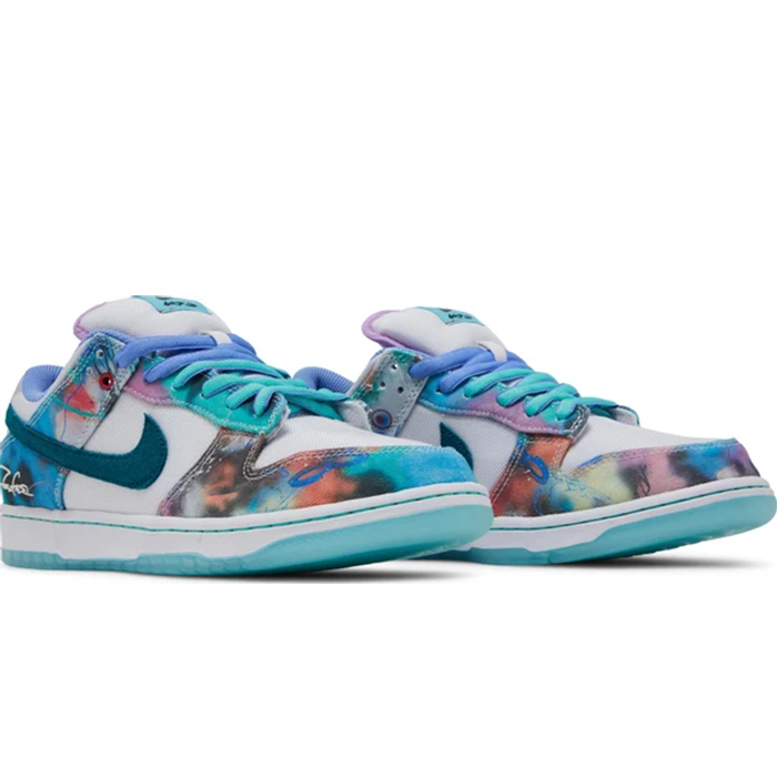 The Futura Laboratories x Nike Dunk Low SB 'Bleached Aqua' features a suede Swoosh in a dark teal finish on the white canvas upper, fortified with multicolor canvas overlays covered in Futura's abstract artwork. The artist's signature is inscribed on the lateral heel, while the FL logo appears on the medial side. A co-branded woven tag graces the stuffed tongue. Underfoot, a blue-tinged translucent rubber outsole provides grippy traction.
