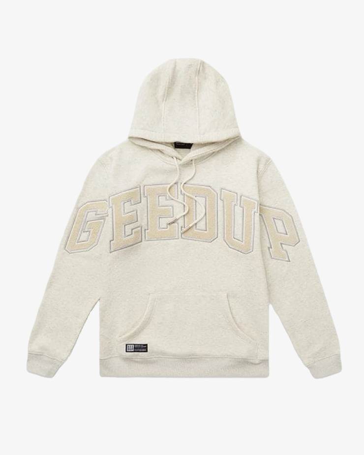Get ready to show your team pride with the GEEDUP. Team Logo Hoodie in 'Wheat Marle'! Featuring a large GEEDUP. logo on the front, this hoodie is perfect for any fan looking to make a bold statement. Stay cozy and stylish while supporting team GEEDUP.