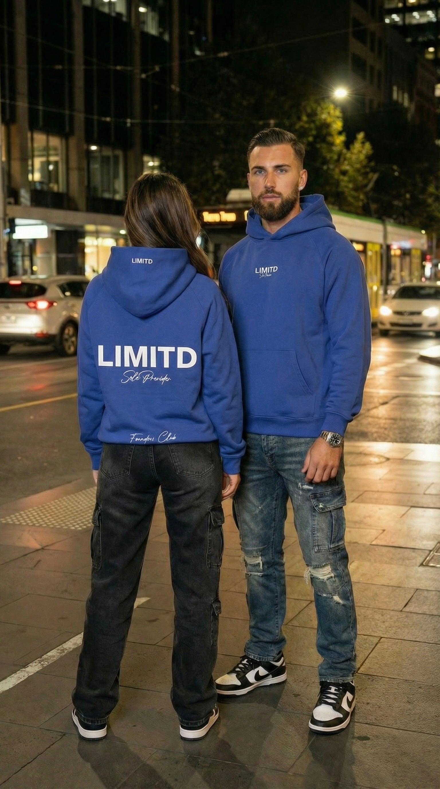 Get cozy and stylish with the LIMITD Founder's Club Hoodie in 'Royal Blue'. Made with high-quality 350gsm premium fleece, this oversized hoodie features raglan style sleeves for a comfortable fit. The 3D rubber print and embroidered details add a unique touch to this 50% cotton, 50% polyester blend. Stay warm and stand out in style.