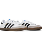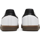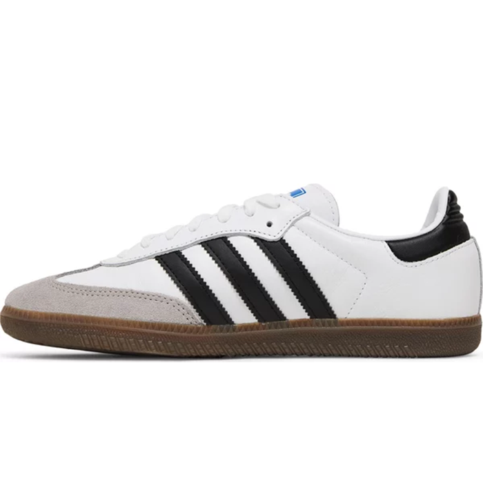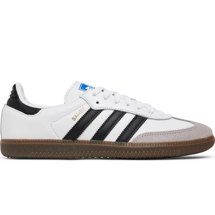 A faithful reissue of an iconic style, the adidas Samba OG retains vintage design lines in a contemporary look for a modern lifestyle. This 'Cloud White' variant is built with a full-grain leather upper complemented by suede at the T-toe, serrated Three-Stripes and a contrast heel panel. Bluebird and foil logos authenticate the retro feel. This low-top is completed with a multi-directional tread pattern on the gum rubber outsole.