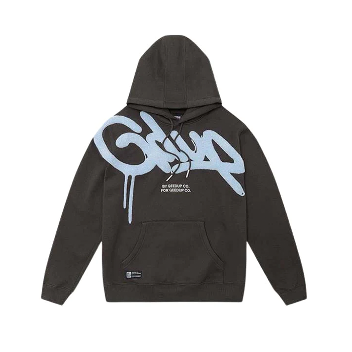 Experience the ultimate streetwear vibe with the GEEDUP. Handstyle Hoodie. Featuring the iconic GEEDUP. logo in a hand-drawn style on the front, this hoodie is the perfect combination of urban and edgy. The graphite and pale blue will make you stand out from the crowd. Get GEEDUP. now and elevate your street style game!