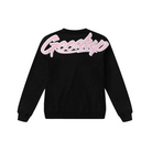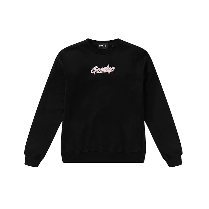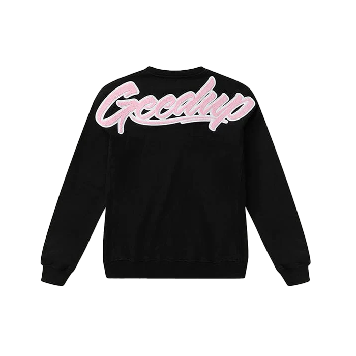 Stay on trend with the GEEDUP. OS Script Crewneck in Black/Pink. Features a playful pink script logo on a classic black crewneck. Perfect for adding a pop of color to your wardrobe. Stay stylish and comfortable with GEEDUP.