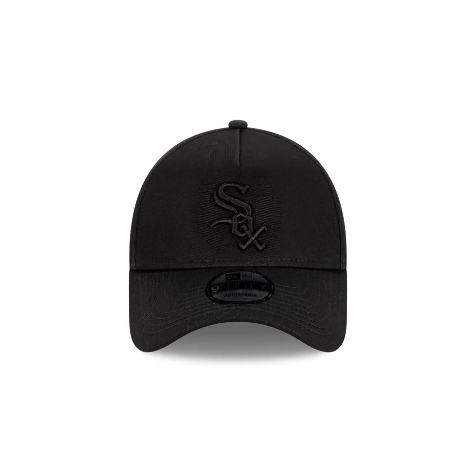 The Chicago White Sox MLB Essentials Black on Black 9FORTY A-Frame features an embroidered White Sox logo at the front panels with a tonal NE Flag on the left side.