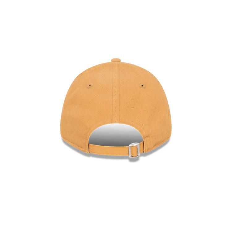 The New York Yankees MLB Essentials Wheat 9FORTY Adjustable features an embroidered white Yankees logo on the front panels of a structured crown with a NE Flag logo on the left, and an adjustable d-ring enclosure at the back.