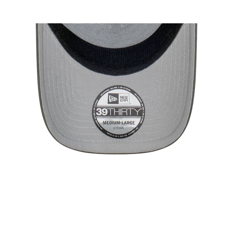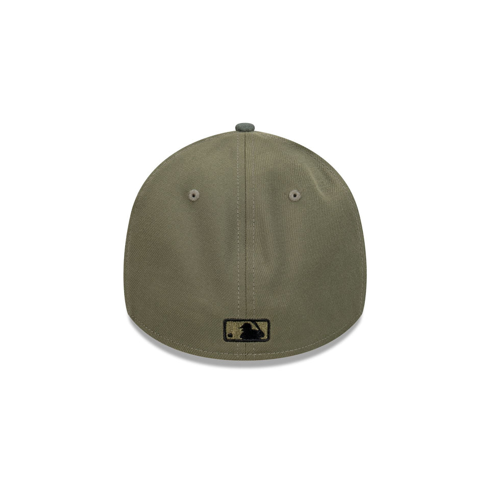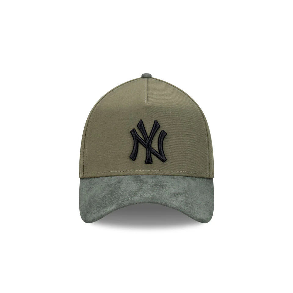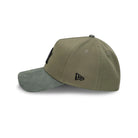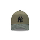 The New York Yankees Olive Premium 39THIRTY A-Frame™ Stretch Fit features a contrast embroidered raised Yankees logo on a high-profile pinched front panel, suede tonal visor with grey undervisor, and a league logo at the back of a fitted enclosure.