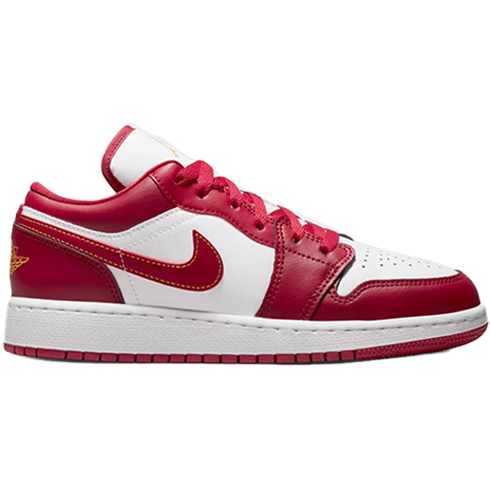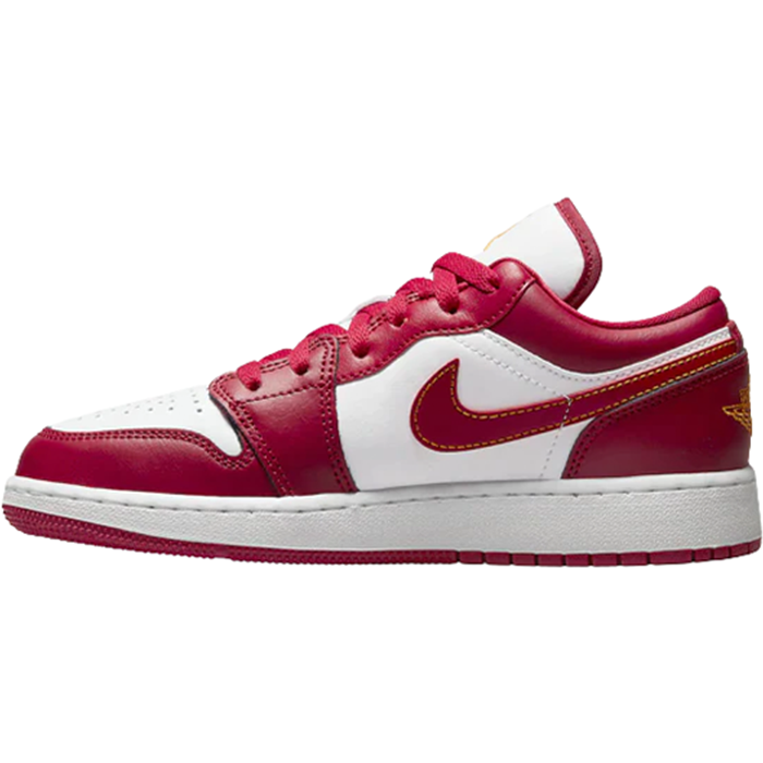 The Nike Air Jordan 1 Low 'Cardinal Red' is a stunning sneaker that combines style and comfort. This low-top shoe features a sleek and modern design with a striking red and white colorway, accented with subtle hints of yellow on the stitching and the iconic Air Jordan Wings logo on the heel. The upper is made of premium leather with perforations for breathability, while the rubber outsole offers excellent traction on any surface. The shoe also features Nike Air cushioning in the sole, providing responsive and comfortable cushioning for all-day wear. The Nike Swoosh on the side adds a touch of branding to this classic shoe. Whether you're on the court or hitting the streets, the Nike Air Jordan 1 Low 'Cardinal Red' with its hints of yellow is sure to elevate your style game and turn heads wherever you go.