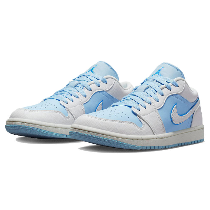 The Nike Air Jordan 1 Low 'Reverse Ice Blue' is the perfect combination of style and comfort. The shoe features a white and ice blue leather upper that gives it a fresh and clean look. The use of high-quality leather ensures durability and long-lasting wear, while the low-top design offers increased flexibility and ease of movement. The signature swoosh logo on the side of the shoe is white with a dark blue outline, adding a subtle yet striking contrast to the overall design. The Air-Sole unit in the heel provides superior cushioning and support, making it perfect for both casual wear and athletic activities. Overall, the Nike Air Jordan 1 Low 'Reverse Ice Blue' is a must-have for sneaker enthusiasts and fashion-conscious individuals alike.