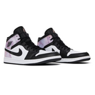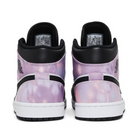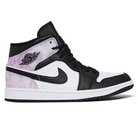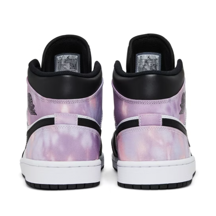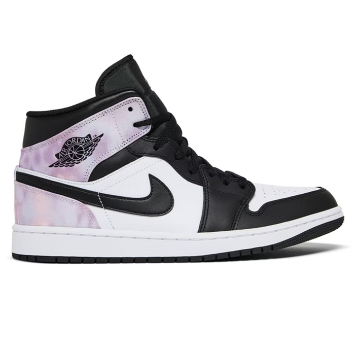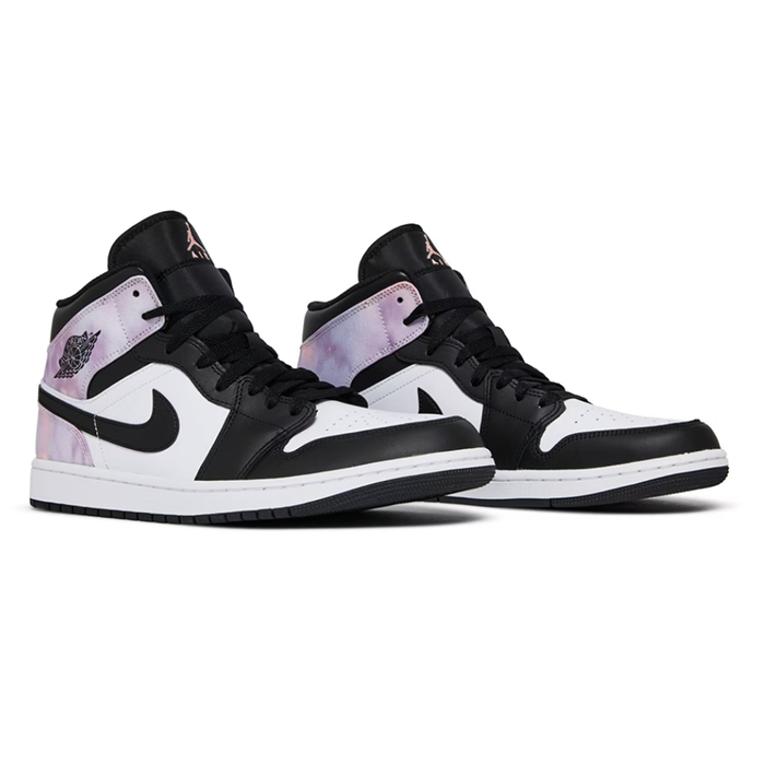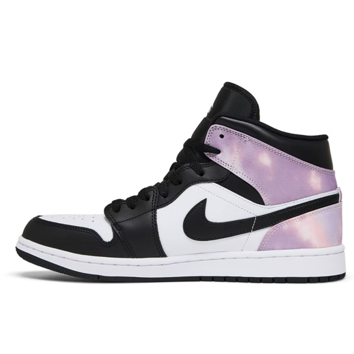 The Nike Air Jordan 1 Mid 'Zenmaster' shoe is a bold and stylish footwear option for those who want to make a statement with their footwear. The black leather around the front of the shoe is accentuated with white detailing, creating a striking contrast that draws the eye. The black swoosh and sole further enhance this effect, while the purple and pink tie-dye at the heel and ankle add a pop of color and a touch of playful personality to the overall design. With its combination of sleek design and eye-catching details, the Nike Air Jordan 1 Mid 'Zenmaster' shoe is a must-have for anyone who wants to elevate their footwear game.
