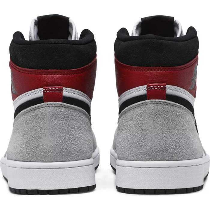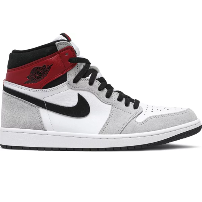 The Air Jordan 1 Retro High OG 'Light Smoke Grey’ showcases a pop of Varsity Red on the ankle flap, stamped with a classic Jordan Wings logo on the lateral side. The rest of the upper is finished in strictly neutral tones, highlighted by a white leather base with grey suede overlays. A black Nike Swoosh is complemented by matching black hits on the collar and rubber outsole. Nike branding atop the white nylon tongue tag completes the OG aesthetic.