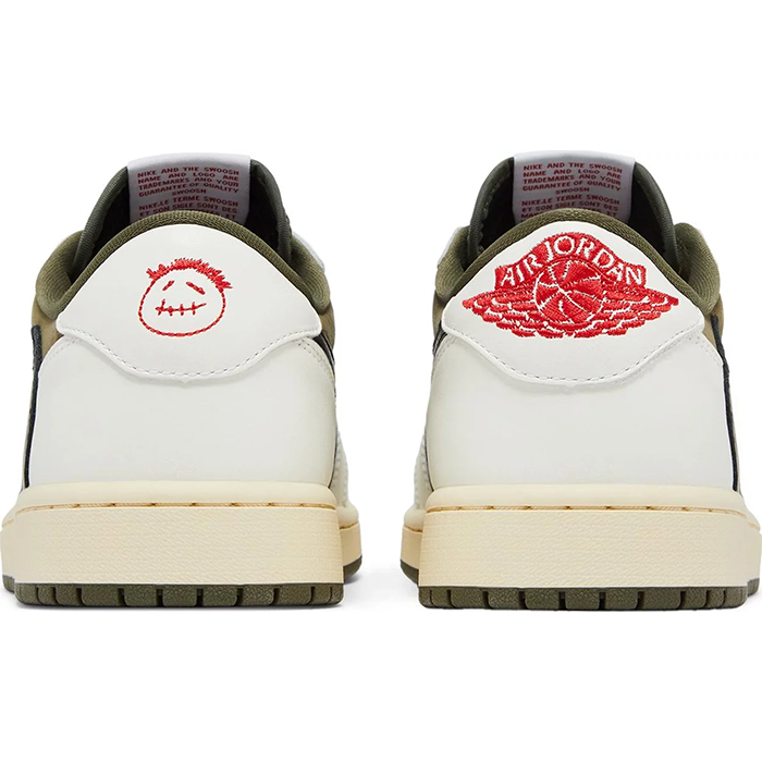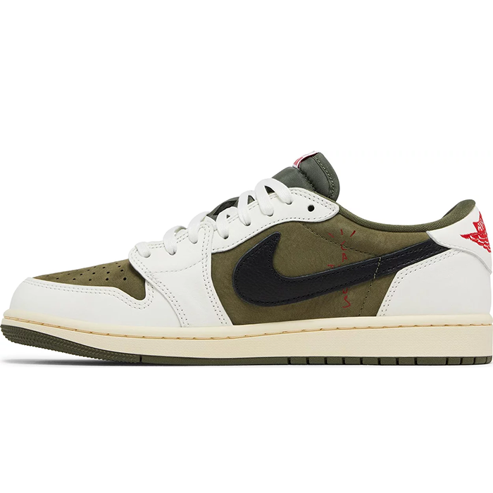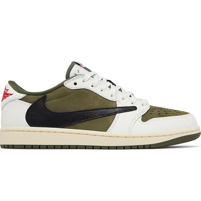 The Travis Scott x Air Jordan 1 Retro Low OG SP 'Medium Olive' combines an olive green suede base with chalk white leather overlays at the forefoot and heel. On the lateral side, Scott's signature reverse Swoosh is rendered in black tumbled leather. Crimson accents land on the Nike Air tongue tag, as well as leather back tabs marked with mismatched Jordan Wings and Cactus Jack branding. The low-top is mounted on a vintage off-white midsole, reinforced underfoot by a grippy olive rubber outsole.