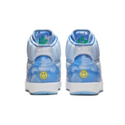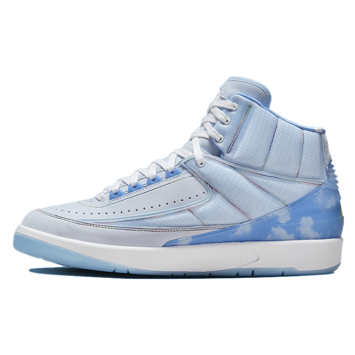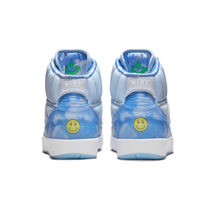 The Nike Air Jordan 2 Retro x J-Balvin 'Celestine Blue' is a stunning shoe that is sure to turn heads. The shoe is made primarily of premium light blue leather that is both durable and comfortable. The heel of the shoe features a unique sky with clouds graphic that is sure to grab attention, along with J-Balvin's signature smiley face. The shoe also features rainbow stitching throughout, adding a pop of color and a unique touch to the design. The tongue features the iconic wings logo that lights up in green, adding an eye-catching detail to this already impressive shoe. This shoe is perfect for anyone looking to make a statement with their footwear, and is a must-have for any sneakerhead or fan of J-Balvin.