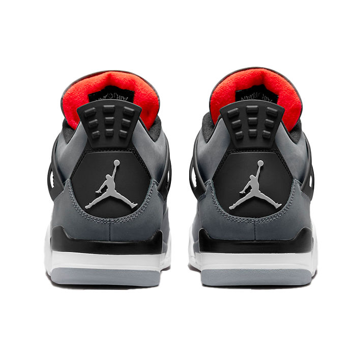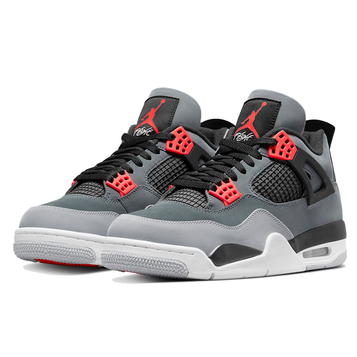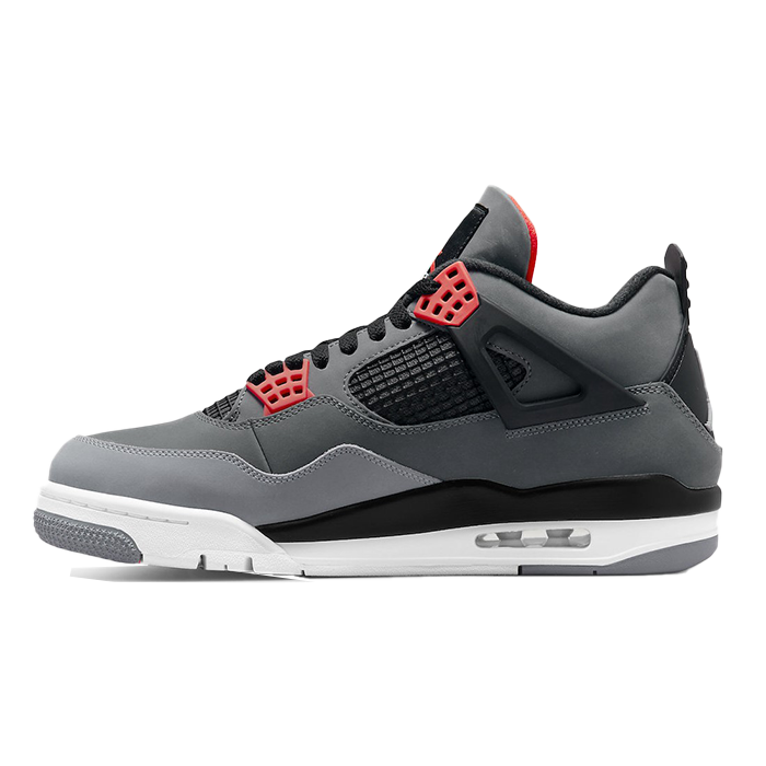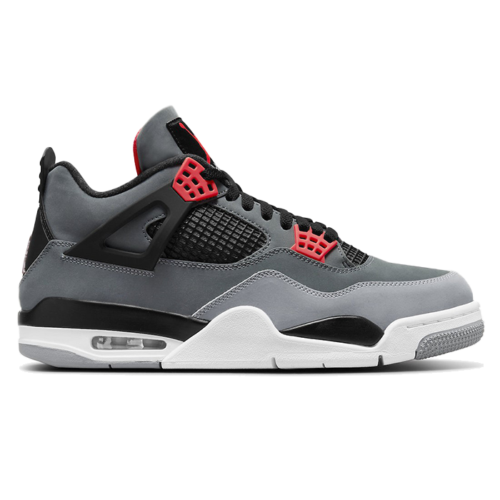 The Air Jordan 4 Retro ‘Infrared’ features distinctive color blocking that recalls the ‘Green Glow’ AJ4 release from 2013. The upper is crafted from smooth nubuck in a charcoal finish. A lighter shade of grey distinguishes the forefoot overlay, while black accents land on the quarter panel netting, structural wings and Jumpman-branded heel tab. The sneaker’s titular hue lights up the woven tongue tag and a quartet of molded eyelets. A polyurethane midsole packs visible Air-sole cushioning in the heel for a smooth ride.