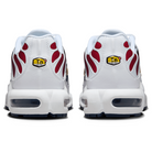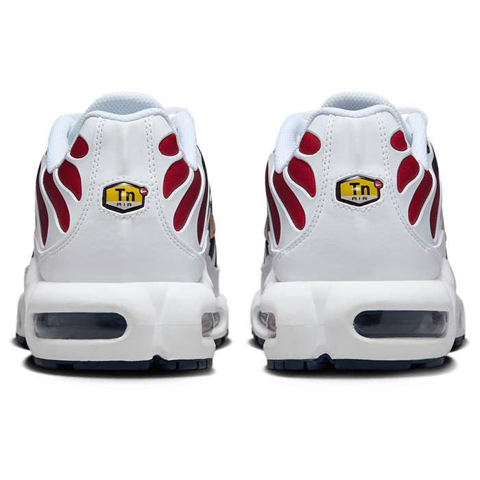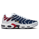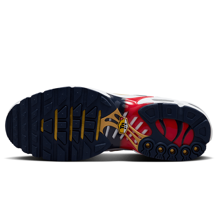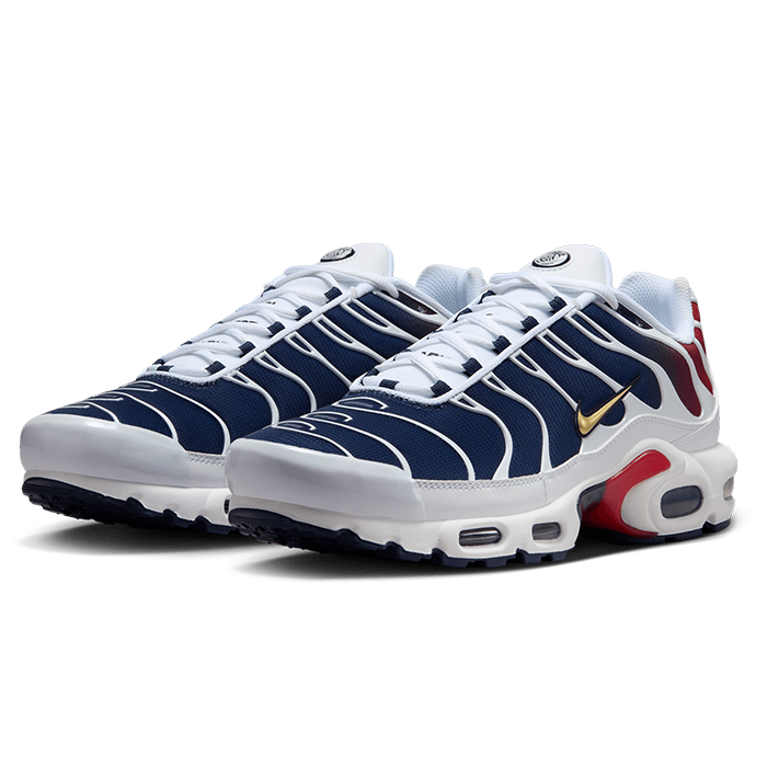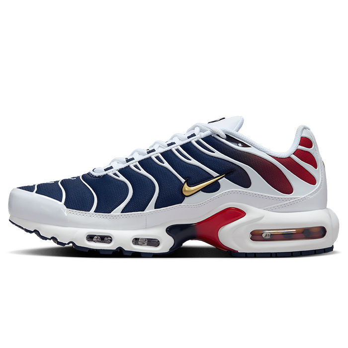 The Paris Saint-Germain x Nike Air Max Plus 'Home Kit' showcases a metallic gold mini-Swoosh on the mesh upper, finished in a gradient navy and crimson finish and bolstered with a contrasting white TPU cage. A PSG badge graces the tongue, while 'Ici C'est Paris' is inscribed on the throat and right sockliner. The sneaker rides atop a white polyurethane midsole with visible Air-sole cushioning and a whale tail-inspired shank in navy and red.