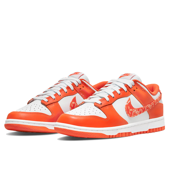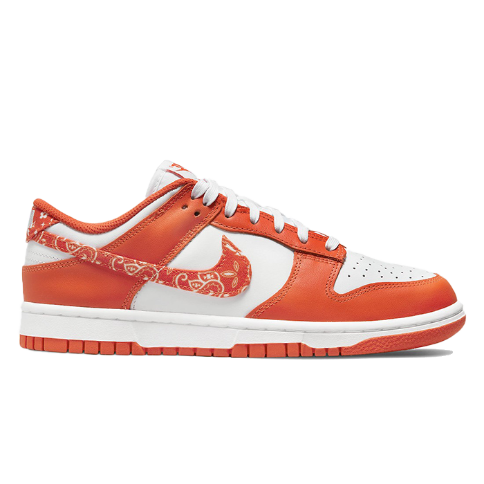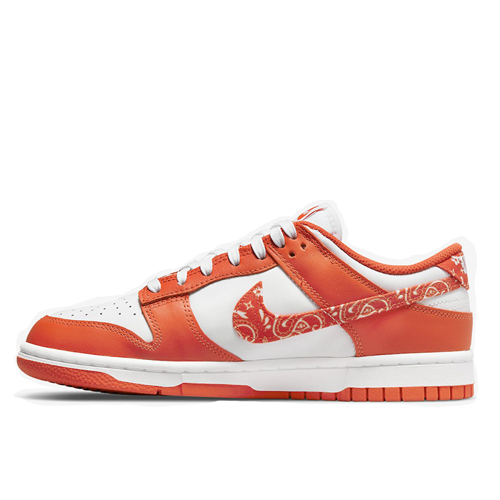 The Nike Dunk Low Essentials 'Orange Paisley' is a stylish and bold addition to the Nike Dunk lineup. The shoe features a striking orange and white leather upper. The standout feature of this shoe is the Swoosh, which showcases a bandana print on a canvas base, adding an element of texture and visual interest to the design. The shoe is constructed with Nike's signature quality and attention to detail, making it both comfortable and durable for everyday wear. With its eye-catching design and superior craftsmanship, the Nike Dunk Low Essentials 'Orange Paisley' is a must-have for any sneaker enthusiast.