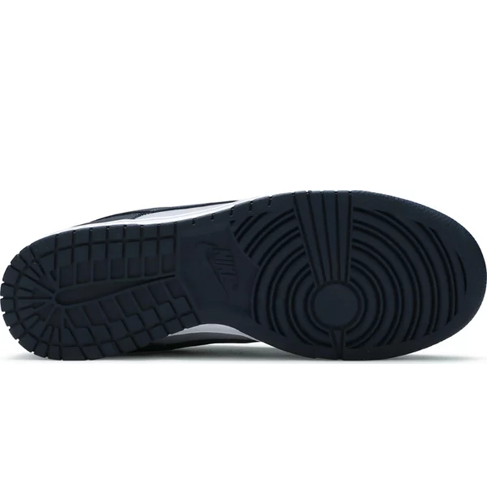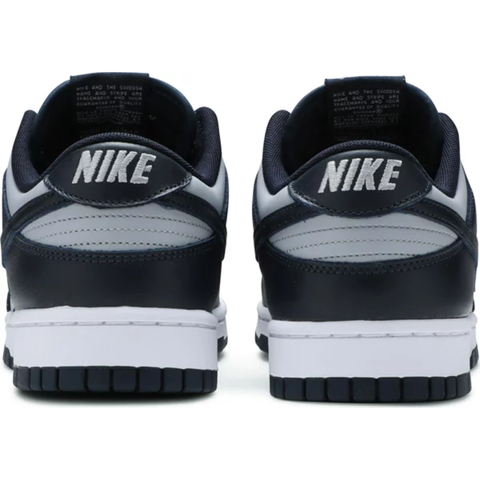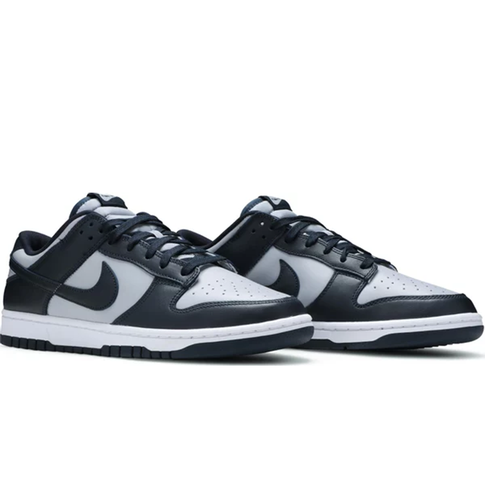 The Nike Dunk Low ‘Georgetown’ showcases a simplistic two-tone palette inspired by the Hoyas, arranged in archetypal color blocking that recalls the introductory ‘Be True to Your School’ series from 1985. The leather upper is finished in a neutral grey base with contrasting overlays in a deep navy hue. Exterior branding hits include a woven Nike tongue tag and an embroidered Nike wordmark on the heel tab. The retro hoops shoe is mounted on a durable rubber cupsole, featuring crisp white sidewalls and a navy rubber outsole.