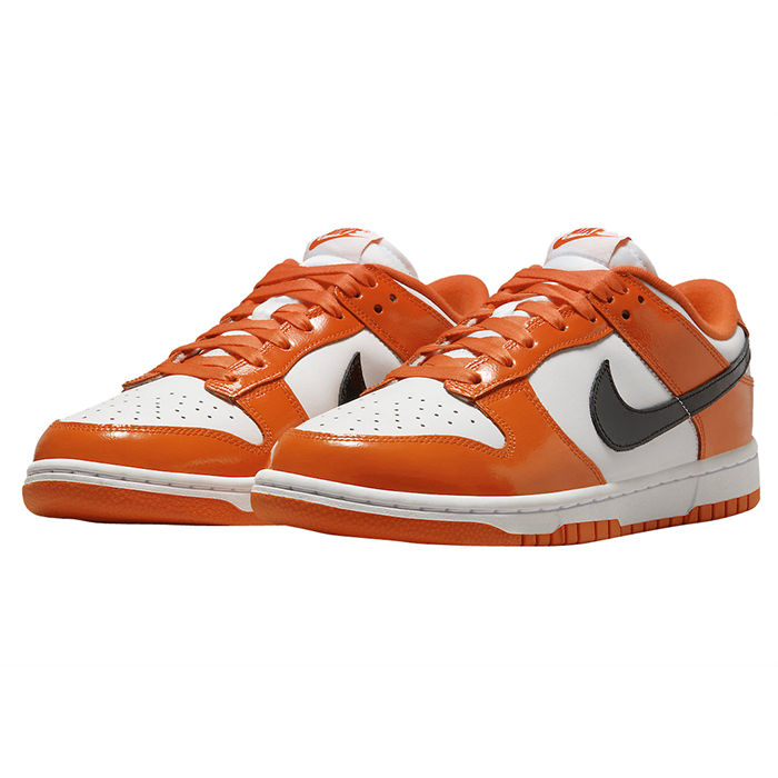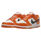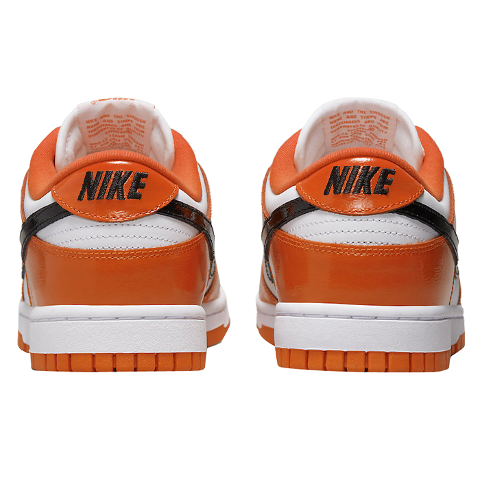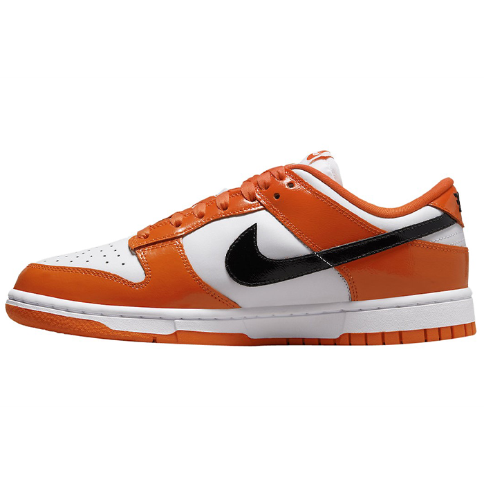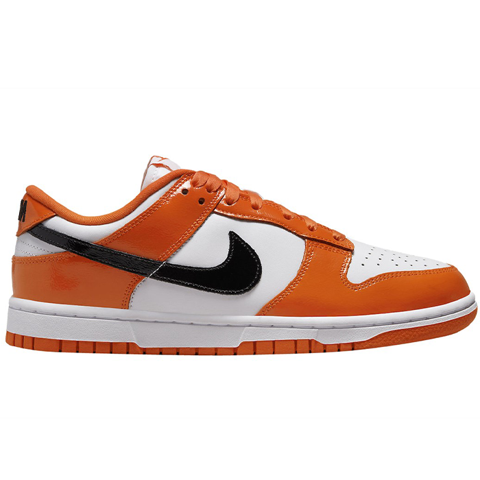 The Nike Dunk Low 'Patent Halloween' is a limited edition sneaker that combines classic Dunk Low design with a spooky twist. The shoe features a striking orange and black patent leather upper, which gives it a shiny and reflective appearance. The black Swoosh and orange laces complement the shoe perfectly, while white leather accents add contrast to the design. The shoe is built with a comfortable cushioned midsole and a durable rubber outsole for reliable traction. Whether you're looking to add some flair to your sneaker collection or just in search of a unique Halloween-themed shoe, the Nike Dunk Low 'Patent Halloween' is a must-have.