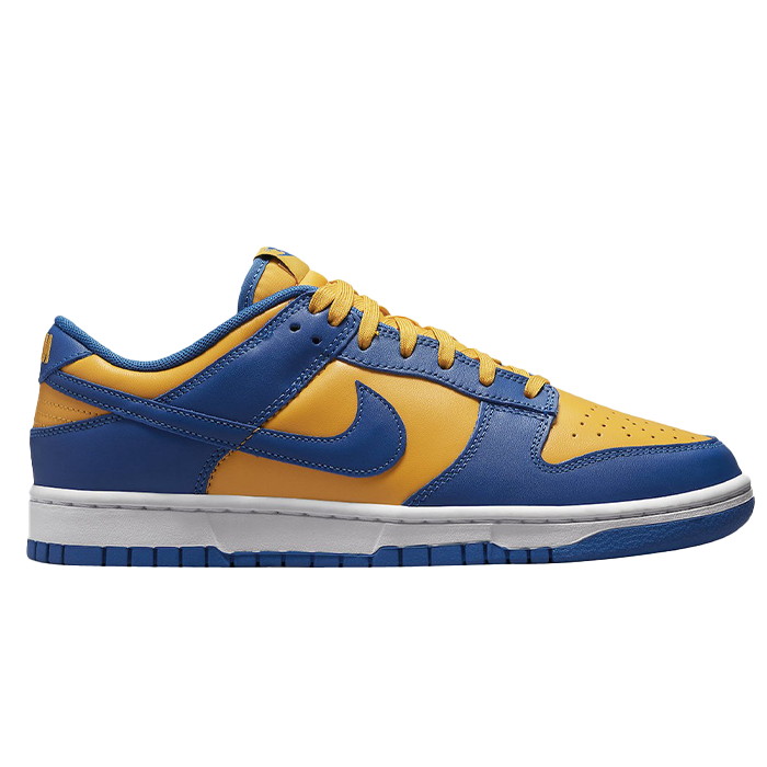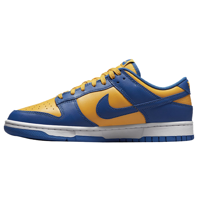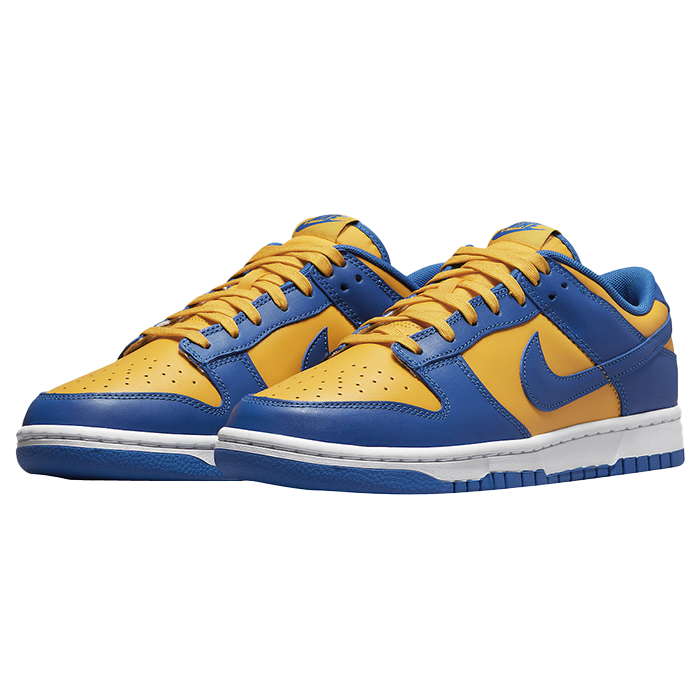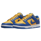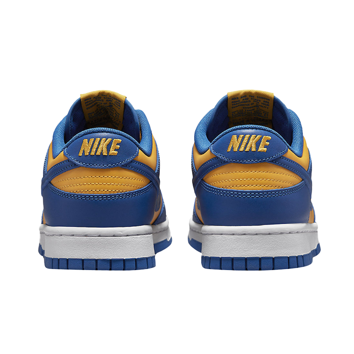 The Nike Dunk Low 'UCLA' sneakers are a must-have addition to any sneakerhead's collection. The classic silhouette is updated with a vibrant yellow and blue leather upper that pays homage to the iconic colors of the University of California, Los Angeles. The colorway is complemented by a crisp white midsole that provides a clean contrast and finishes off the overall look. These sneakers are not just stylish but also comfortable, thanks to the high-quality materials used in their construction. Whether you're a die-hard UCLA fan or simply looking for a standout pair of sneakers, the Nike Dunk Low 'UCLA' is sure to turn heads and elevate any outfit.