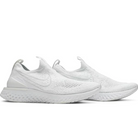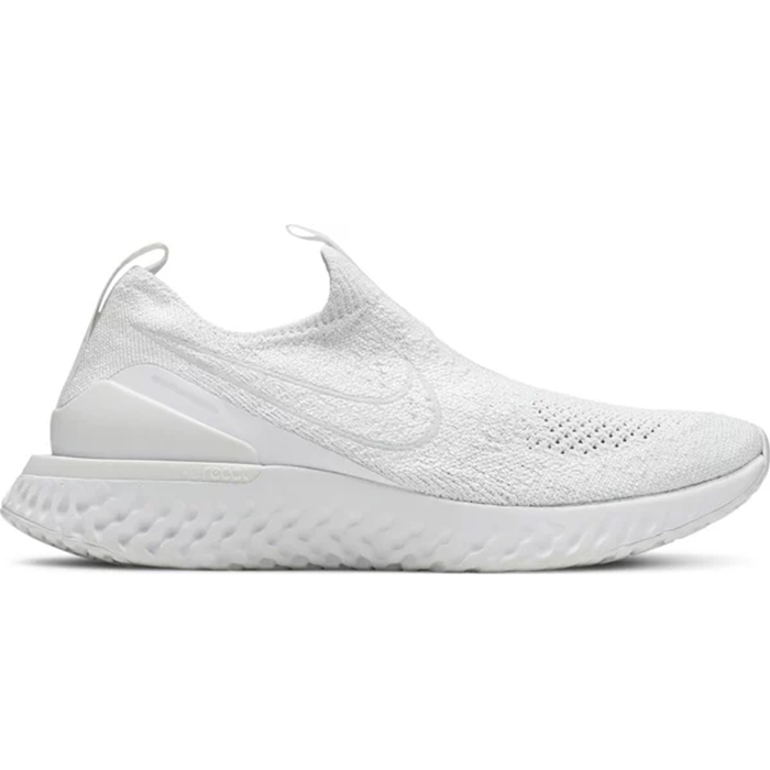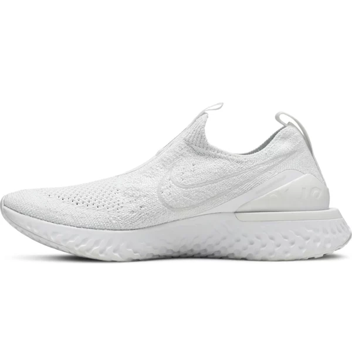 Released May 2019 for summer running with a minimalist look, the Wmns Epic Phantom React Flyknit 'Triple White' is made with a lightweight construction and unassuming neutral tones. The breathable Flyknit upper consists of stretchy and non-elastic yarns for a mix of flexibility and support, and a heel cage in back reinforces the stability concept without extra bulk. Underfoot, data-informed React foam cushioning with debossed, pressure-mapped traction promises maximum energy return.