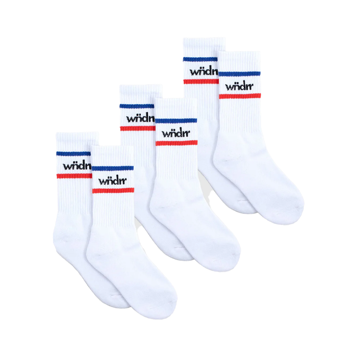 Introducing the WNDRR Challenger Socks - white socks with bold blue and red accents, featuring the iconic WNDRR logo. Keep your feet stylish and comfortable with these eye-catching socks.