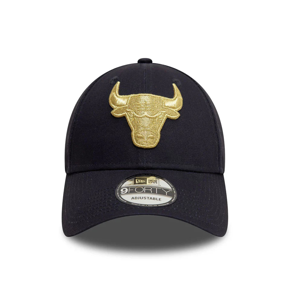 The Chicago Bulls Metallic Badge 9FORTY Adjustable features an embroidered raised Bulls logo in golden metallic thread on a structured crown, a contrast metallic thread NE Flag logo on the left, and an adjustable cloth strap enclosure.