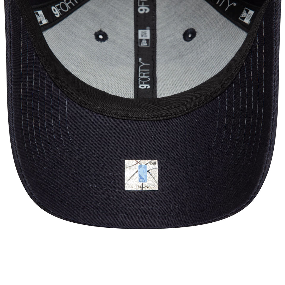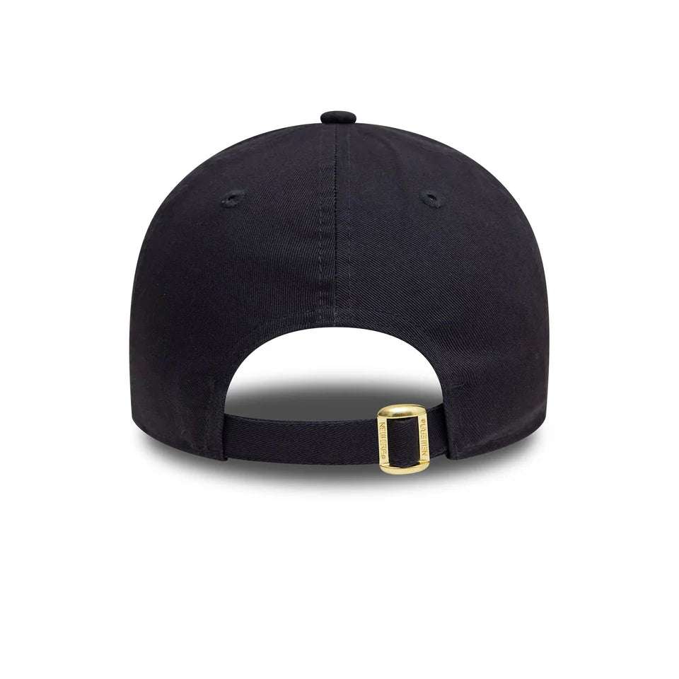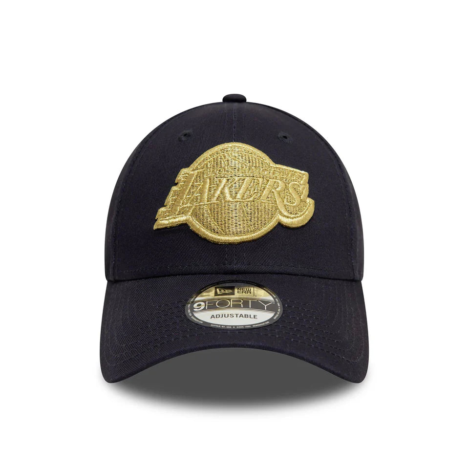 The Los Angeles Lakers Metallic Badge 9FORTY Adjustable features an embroidered raised Lakers logo in golden metallic thread on a structured crown, a contrast metallic thread NE Flag logo on the left, and an adjustable cloth strap enclosure.
