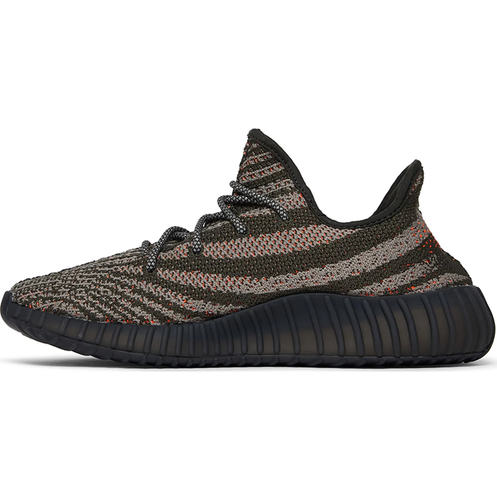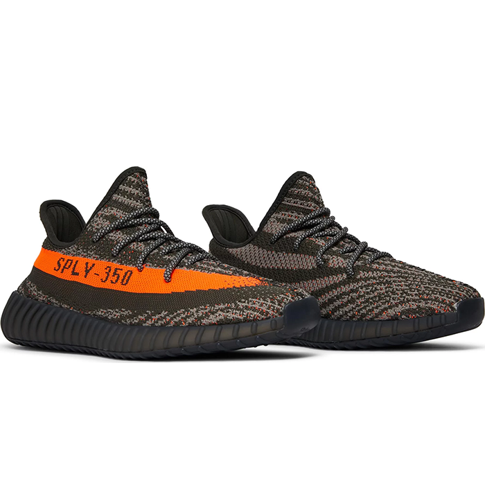 The adidas Yeezy Boost 350 V2 ‘Carbon Beluga’ brings together vivid pops of color with a patterned design. Rope laces secure the breathable Primeknit upper, rendered in a dark grey finish with wavy black lines and contrasting orange speckles. On the lateral side, a matching orange stripe displays ‘SPLY-350’ branding. Responsive cushioning is provided by a full-length Boost midsole, housed within a ribbed TPU cage and supported underfoot by a durable rubber outsole.