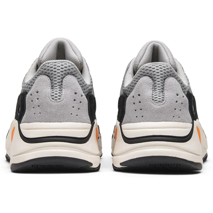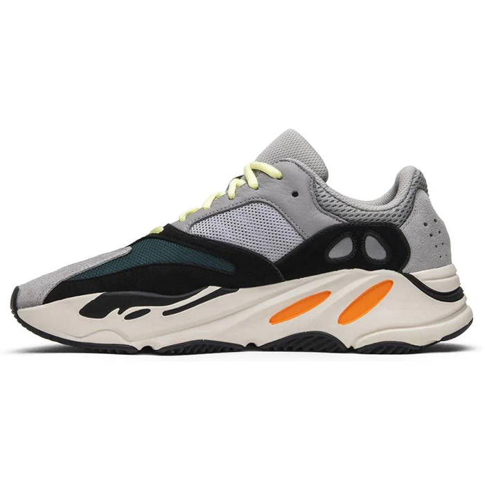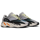The Adidas Yeezy Boost 700 'Wave Runner' is a highly sought-after sneaker that combines style and comfort in one package. Featuring a mix of premium materials, including suede and mesh, the shoe boasts a distinctive grey and blue colorway with hints of orange and black for added contrast. Its midsole is equipped with Adidas' signature Boost technology, providing superior cushioning and responsiveness for a comfortable ride. The Wave Runner also features a durable rubber outsole with a unique geometric pattern for enhanced traction and grip. This sneaker has become a favorite among sneaker enthusiasts and casual wearers alike, with its iconic design and unbeatable comfort.