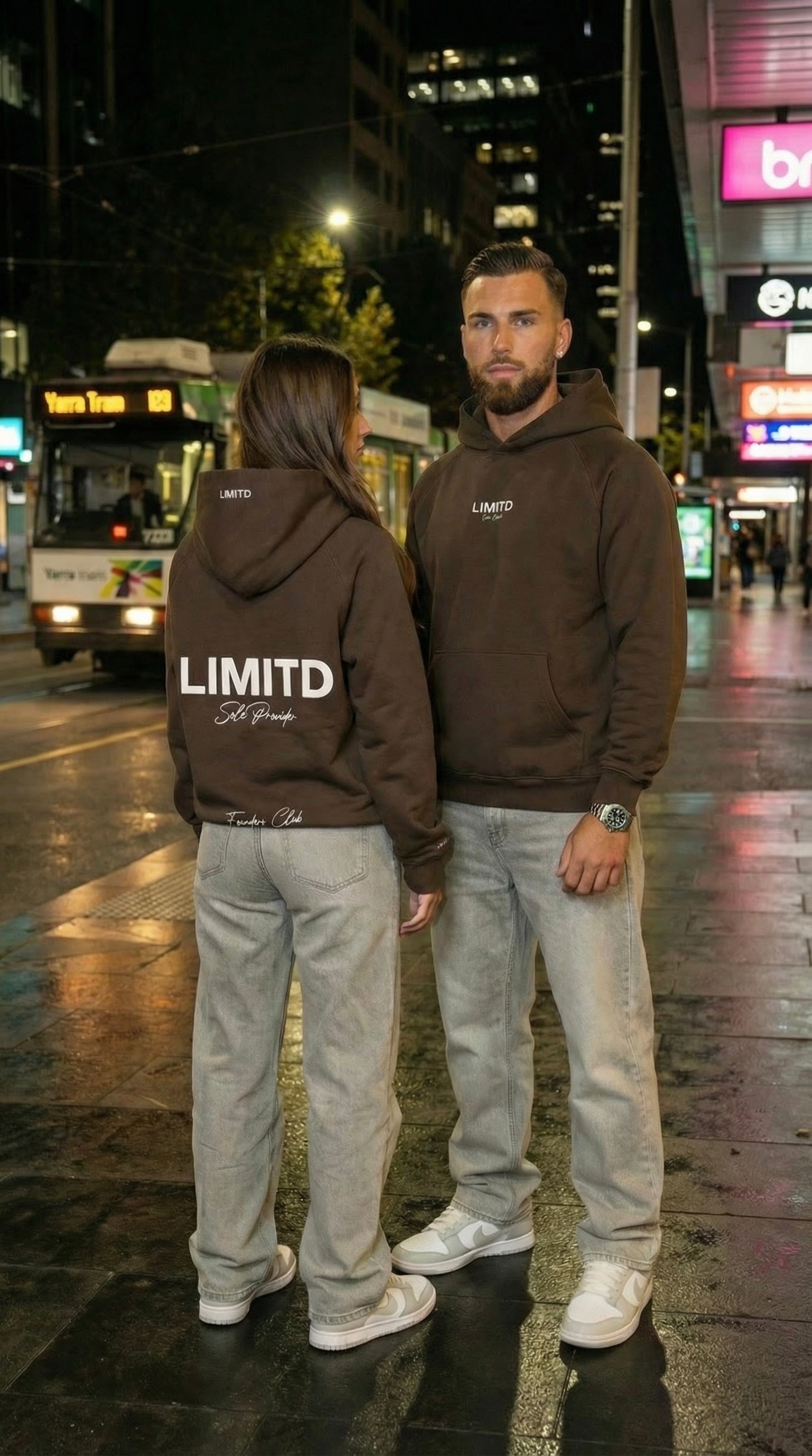 Get cozy and stylish with the LIMITD Founder's Club Hoodie in 'Chocolate'. Made with high-quality 350gsm premium fleece, this oversized hoodie features raglan style sleeves for a comfortable fit. The 3D rubber print and embroidered details add a unique touch to this 50% cotton, 50% polyester blend. Stay warm and stand out in style.