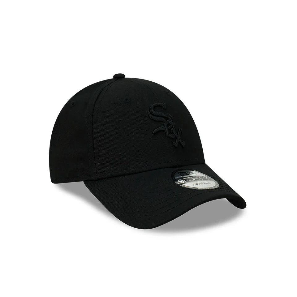 The Chicago White Sox MLB Essentials Black on Black 9FORTY Adjustable features a black embroidered White Sox logo on the front panels of a structured crown with an adjustable D-Ring enclosure at the back.