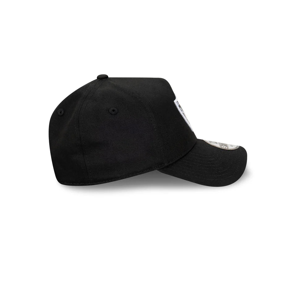 The Las Vegas Raiders NFL Essentials 9FORTY A-Frame features an embroidered Raiders logo at the front panels with a tonal undervisor and a NE Flag logo on the left side.