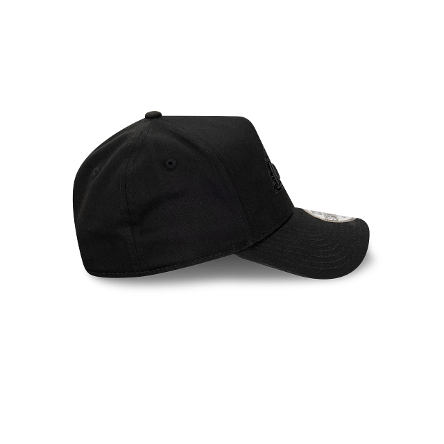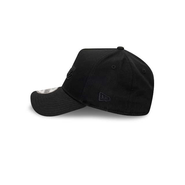The Los Angeles Lakers NBA Essentials Black on Black 9FORTY A-Frame Snapback features an embroidered black Lakers logo on the front panels of a pitched structured crown with a snapback enclosure at the back.