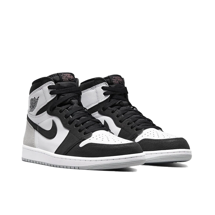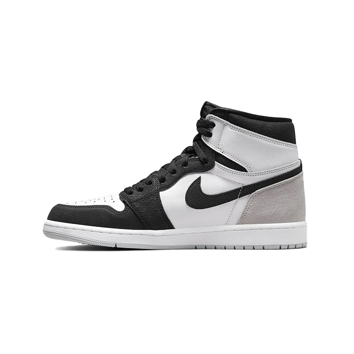 The Nike Air Jordan 1 High 'Stage Haze' is a striking and stylish sneaker that is sure to turn heads. Featuring a unique colorway of black, white, and grey, the shoe has a bold and edgy look that is perfect for those who want to make a statement. The upper is made of a combination of leather and suede, providing both durability and a premium feel. The iconic Air Jordan logo is prominently displayed on the side of the shoe, while the Nike swoosh is featured on the toe box and tongue. The shoe also includes Nike's Air cushioning technology for maximum comfort and support, making it a great option for both casual wear and athletic activities. Overall, the Nike Air Jordan 1 High 'Stage Haze' is a must-have sneaker for any fashion-forward sneaker enthusiast.
