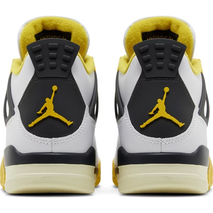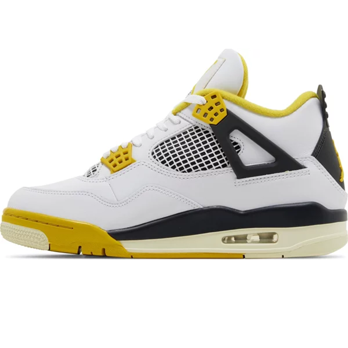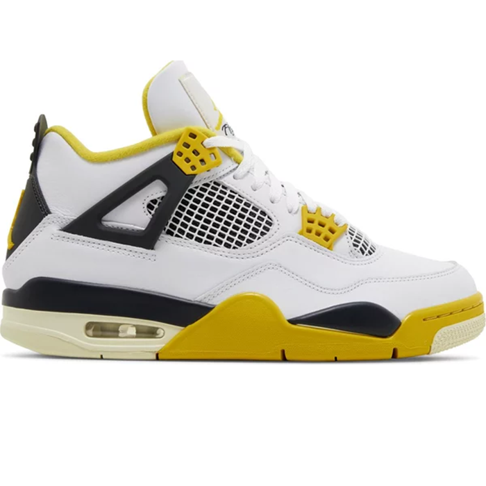 The Women's Air Jordan 4 Retro 'Vivid Sulfur' is built with smooth white leather featuring signature AJ4 details, including breathable quarter panel netting and black TPU support wings. Contrasting yellow accents land on the molded eyelets, interior lining, and the Jumpman branding hits that adorn the tongue and back tab. The sneaker rests on a two-tone polyurethane midsole, fitted with a visible Air-sole unit in the heel.